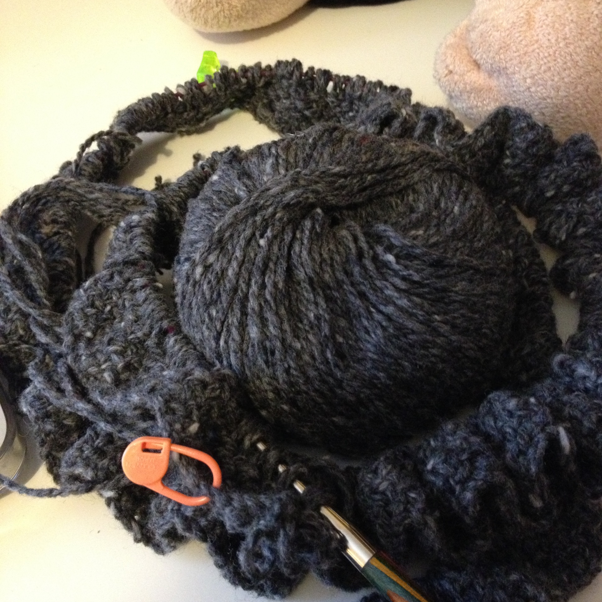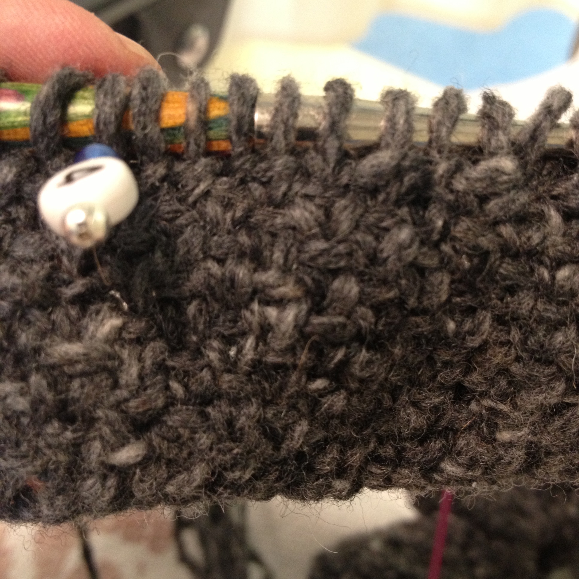 The beauty of this pattern is you can escape the 400+ purls by simply sliding the scarf back to the beginning and continuing with another length of yarn (creating tassels along the way). While I am sure this will look much better in the multi-coloured yarns it was intended for, its working quite well with the Silkroad DK and finally NQR has become QR.