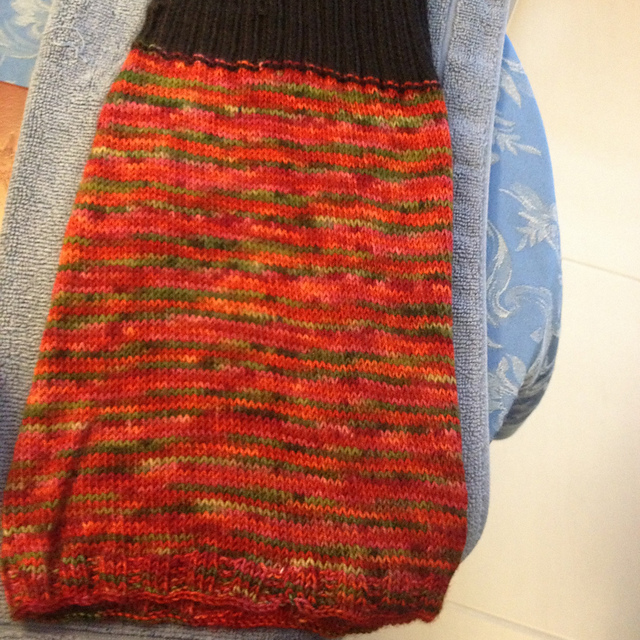 I have finished Howlcat with Debbie Bliss Cashmerino Aran (Black) and Jitterbug (October Afternoon). Would probably choose different colours (ie not black) the next time. While I reconciled myself to the welt like stripes on my fingers when I was knitting, I was convinced that a good rinse or two would resolve the bleeding of Jitterbug. I washed it 11 times and it was still giving some colour. Have given up getting a clear rinse from that. Will try washing future skeins and the old vinegar trick. I love the way Jitterbug knits up. Its still my favourite of the sock yarns I have knit so far… BUT… the colour issue remains a challenge.
