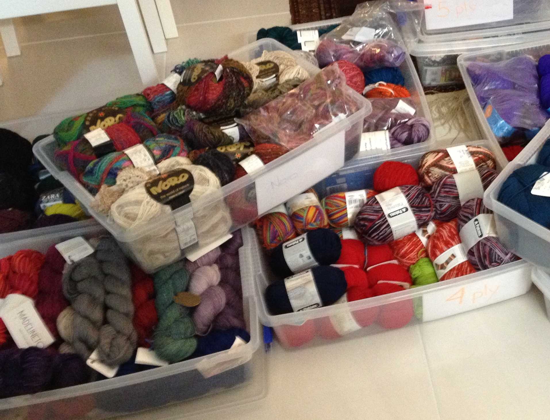While they were busy packing for their trip, I took to stash diving. There were two aims in mind. The first was to update my stash on Ravelry. The second was to clear out any stash that was unlikely to be used and to donate that to Knit-One-Give-One (KOGO). Another knitting buddy mentioned this charity at the Richmond Knitters SnB last Monday. I went through a hat knitting obsession a few years ago and knit far too many hats that were far too small for me. It was wonderful to discover that there is a charity that not only takes donations of full balls of yarn, but also unwanted hand knits. I took a very large bag of donations – mostly yarn, but some hats and scarves as well – to Wondoflex in Malvern, who are a collection point for KOGO. Ok… I didn’t walk out of Wondoflex empty-handed, but I took in more than I left with.